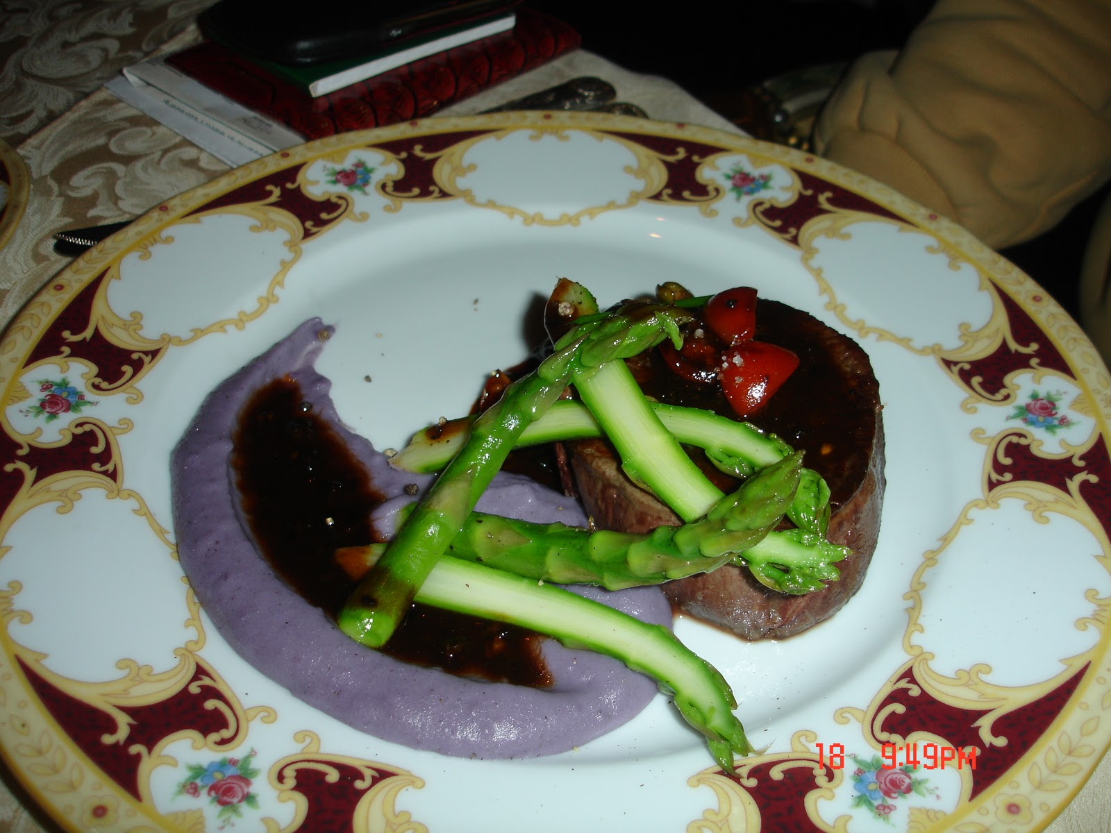 Patates ve bakla ezmesi , üzerine taze sebze ve domates ile sunulan siyah mantar soslu dana fileto da tadılmaya değerdi.(Roasted fillet of prime beef with morel juice served with vitelottes potatos , fava beans and tomberry tomato)
