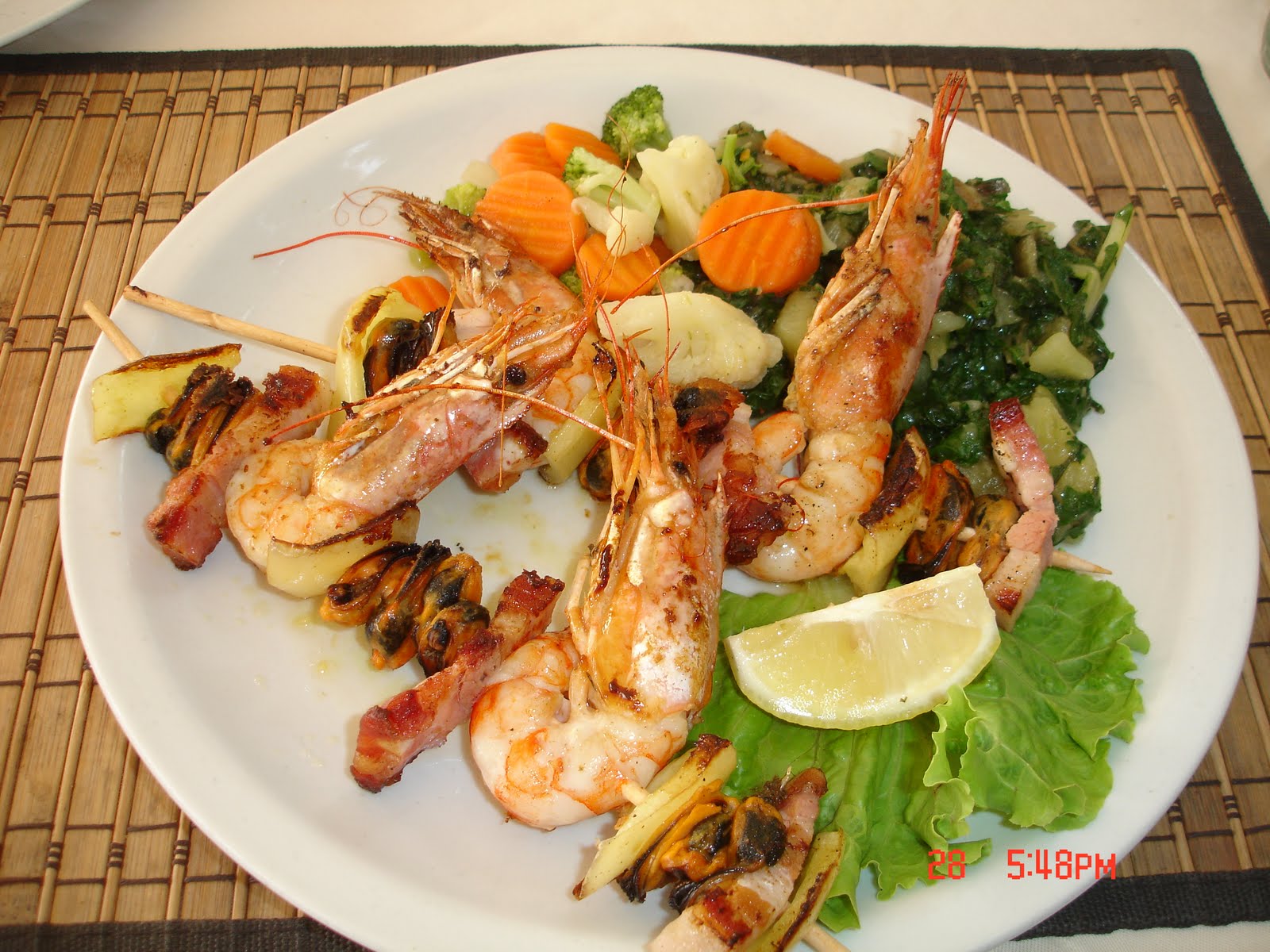 Benim seçimim de, farklı olması açısından (ne kadar farklı derseniz…), Karides kebabı.(Raznjic skampi/gambori)(Shrimps kebab) Tabii ki bu siparişi verirken, isminde kebap geçmesinden dolayı beklentim oldukça yüksekti. Ancak gelen, kalamar ve midye şiş, haşlanmış sebze eşliğinde. Ben her ne kadar yemesem de, aralarda domuz eti. Yemek genel olarak iyidi diyebilirim. ( 11 Euro)