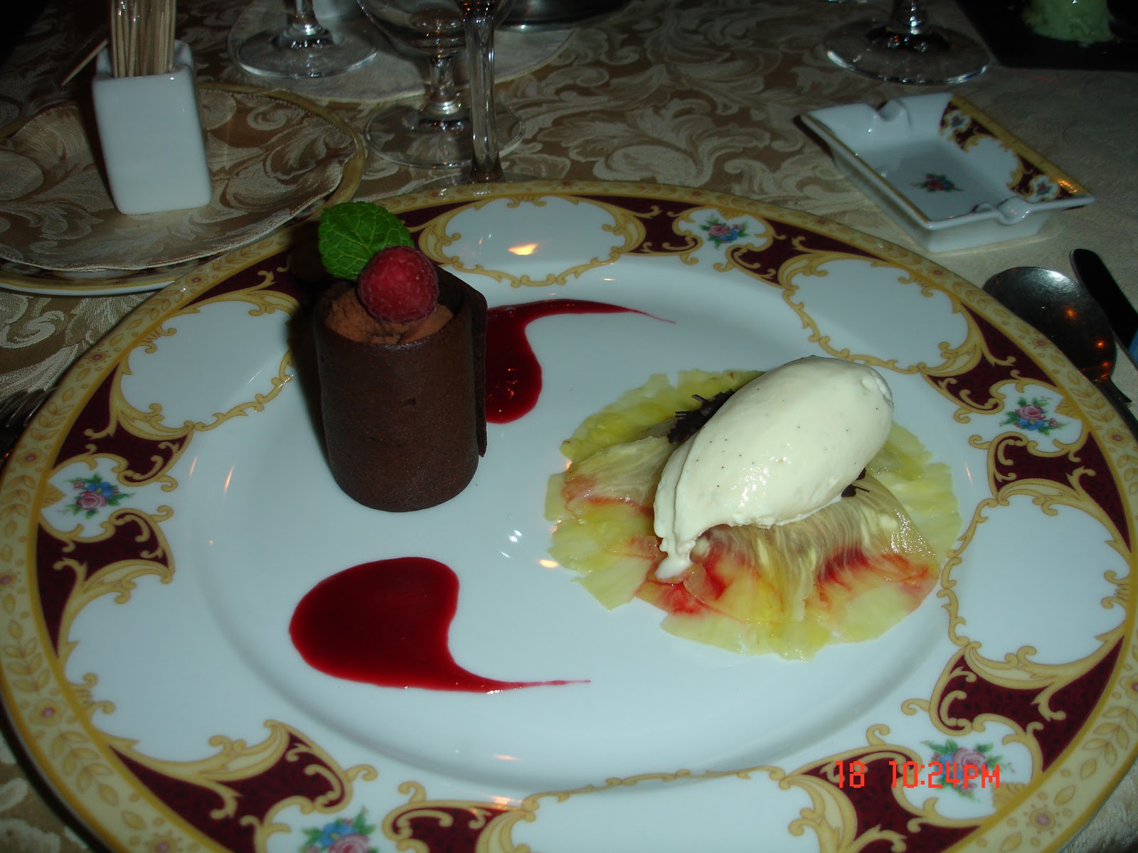 Çikolatalı puro !!! eşliğinde, içi ahududu dolu ananas Raviolli (Raviolli of fresh pinapple filled with country raspberries served with a praline chocolate cigar)