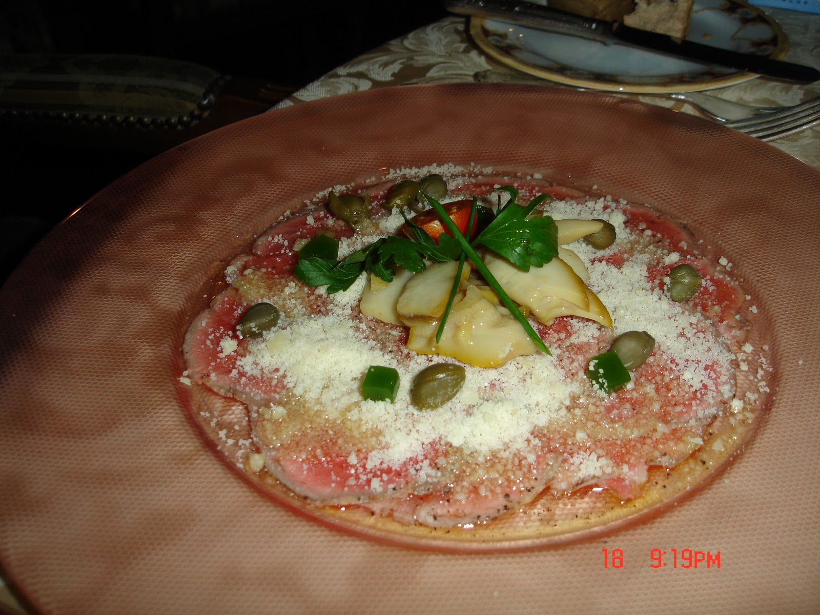 Başlangıç olarak alınan füme dana eti. (Carpaccio of veal served with cepe marinade , lobster oil and parsley jelly)