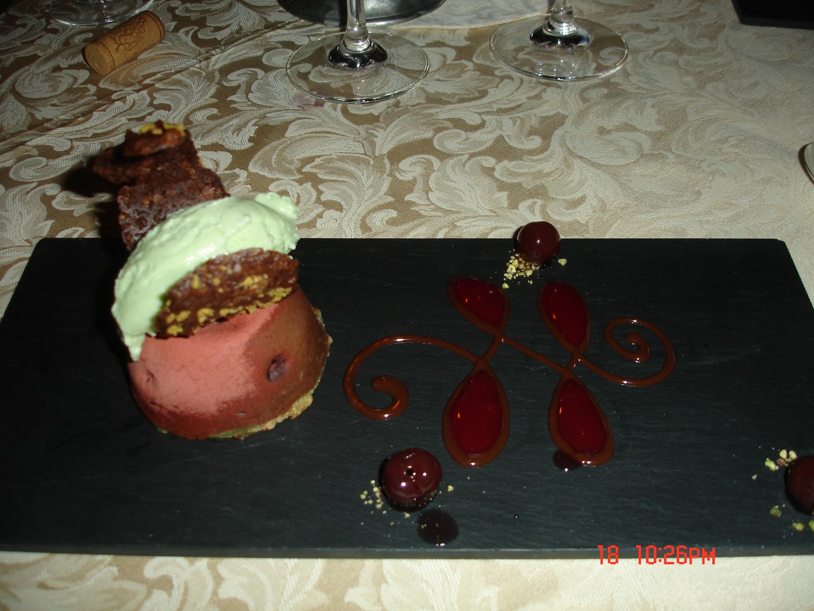 Benim tercihim ise; kiraz ve antep fıstıklı brule eşliğinde Çikolata Markiz. (Chocolate marquise with sweet cherries and pistacho creme brule)