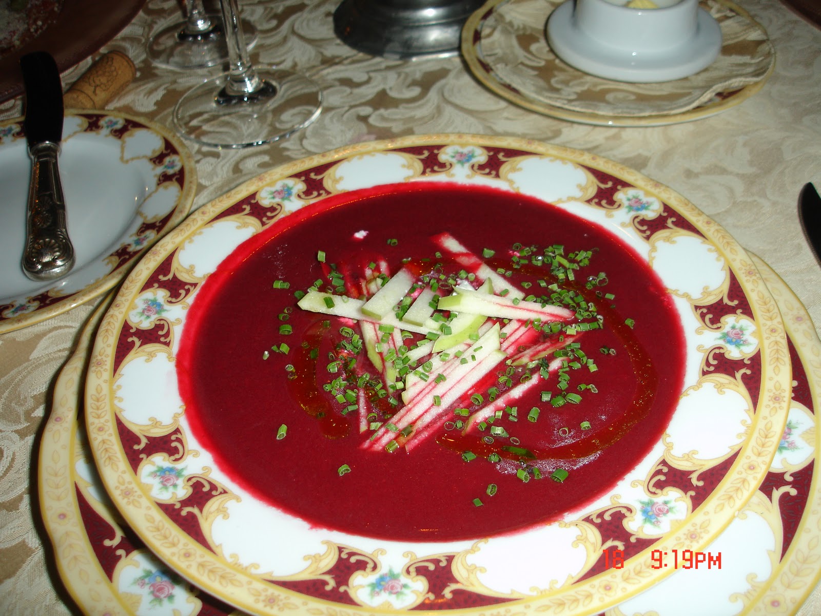 Benim başlangıç olarak tercihim, Ruslara özgü soğuk “Borç Çorbası”. Pancar püresinden yapılmış, keçi peyniri ve elma dilimleri ile servis edildi.(Chilled borsch puree served with antonovka and goat cheese)