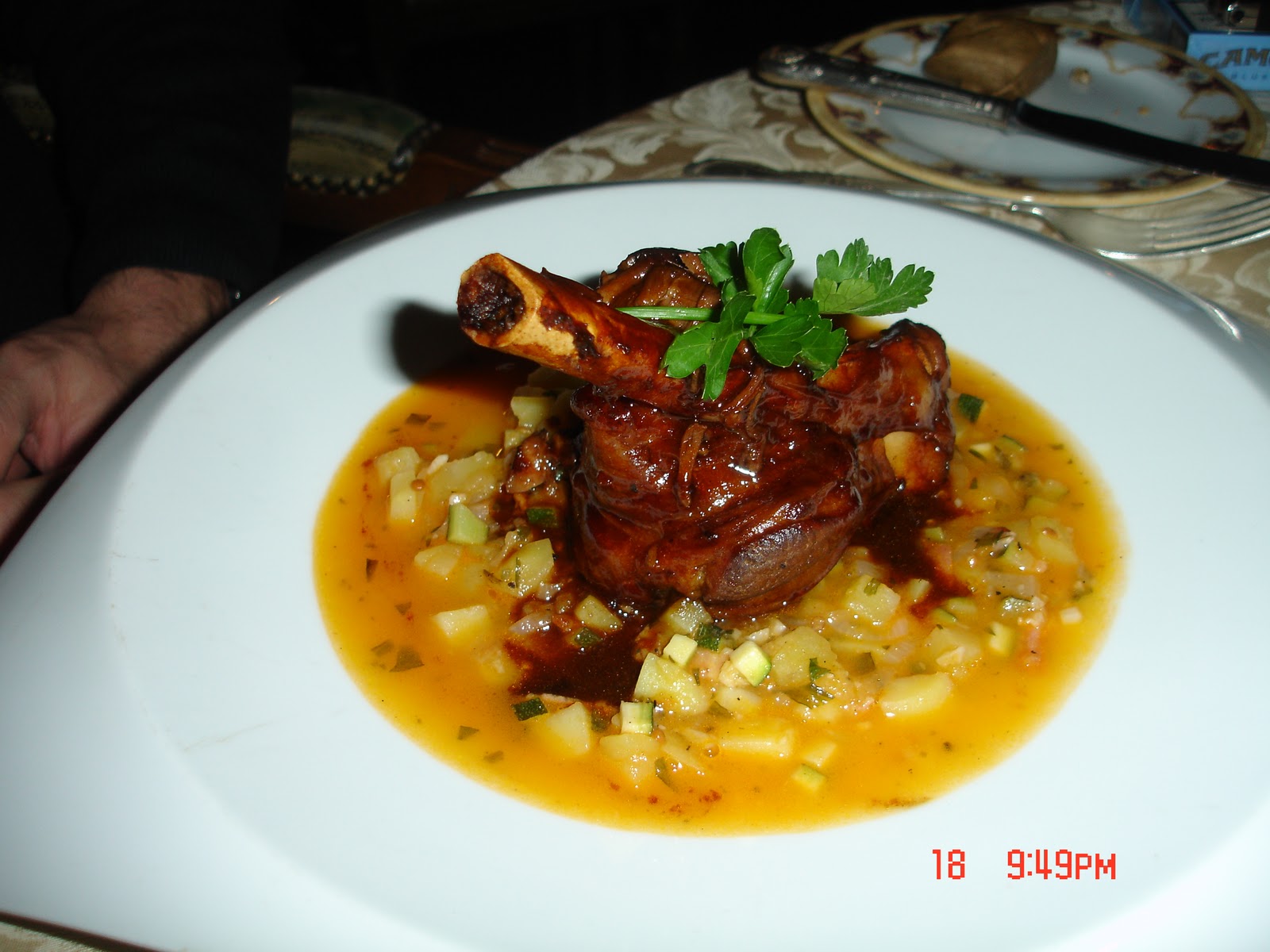 Sebze ile birlikte sunulan kısık ateşte ağır şekilde pişen kuzu incik de kebap tadındaydı (Braised knuckle of welsh lamb served with a new potatoes pie and creamy oyster mushroom)