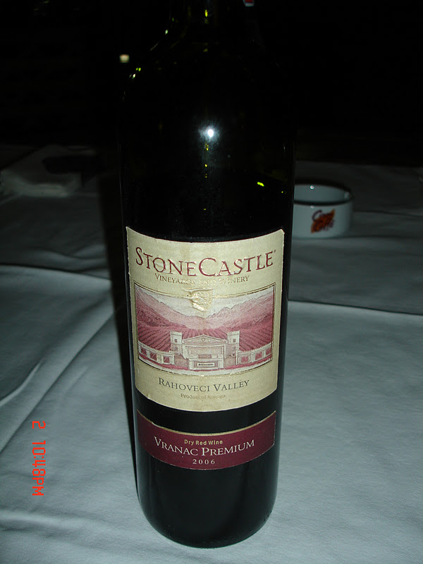 Şarap olarak, yine yöresel bir seçim yaptık. Kosova’nın en bilinen markası olan Stone Castle’ın Rahoveci Vadisinde yetişen Balkanlara özgü Vranac üzümünden yapılan kırmızı sek şarabı.