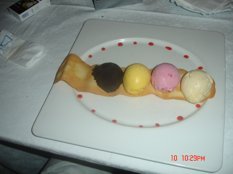 Diğer tatlı seçimi de ev yapımı dondurma , altında ince tatlı kıtır (Assortment of homemade ice-cream and sherbet served on a crispy orange tuile)